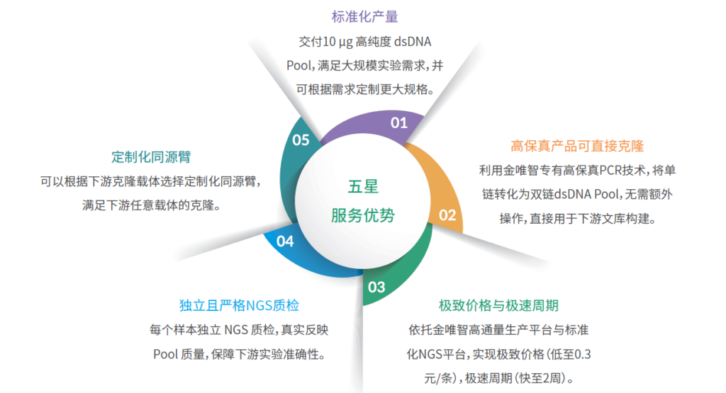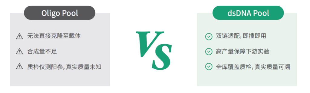 寡核苷酸池(Oligo Pool)作为高通量筛选的原料,主要应用于高通量筛选、基因编辑、突变体库构建等领域。金唯智可提供dsDNA Pool合成服务,将单链Oligo Pool扩增富集为即用型双链DNA文库,可直接用于下游文库构建。