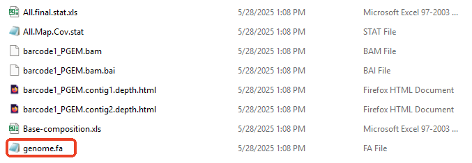 组装结果也有可能包含多个序列,如果出现这种情况,01_Assembly 文件夹中的 genome.fa 文件将包含所有组装好的结果序列。