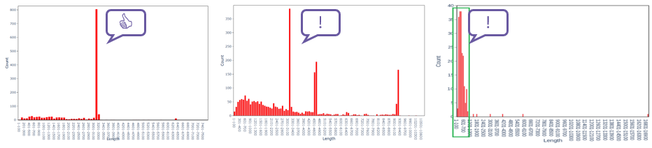 从测序读长长度分布图可一定程度上解释出现不同组装结果的原因:左图测序读长峰形单一,表明样本为单克隆质粒,通常可成功组装;中图出现多个峰,说明样本中可能存在片段缺失、重组或多聚体质粒等情况,可能出现多条组装结果;右图测序读长以短片段为主,不存在主峰,说明样本中可能存在严重降解或浓度虚高等情况,高概率会导致组装失败。