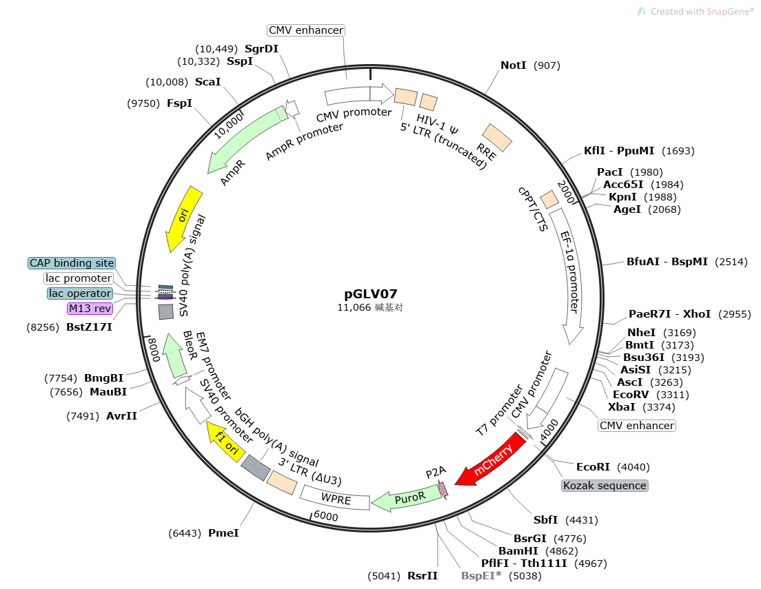 | pGLV07 | pLent-EF1a-MCS-CMV-mCherry-P2A-Puro |