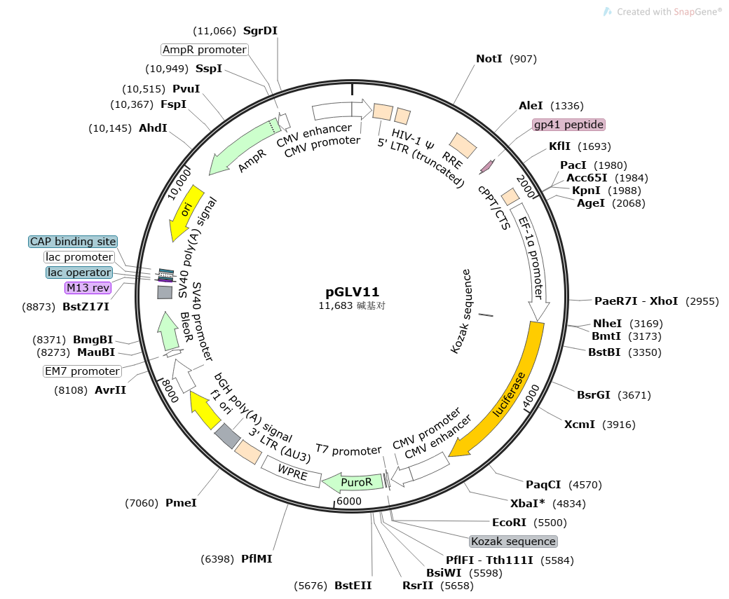 | 过表达载体(抗性+荧光) | pGLV05 | pLent-EF1a-MCS-CMV-GFP-P2A-Puro |